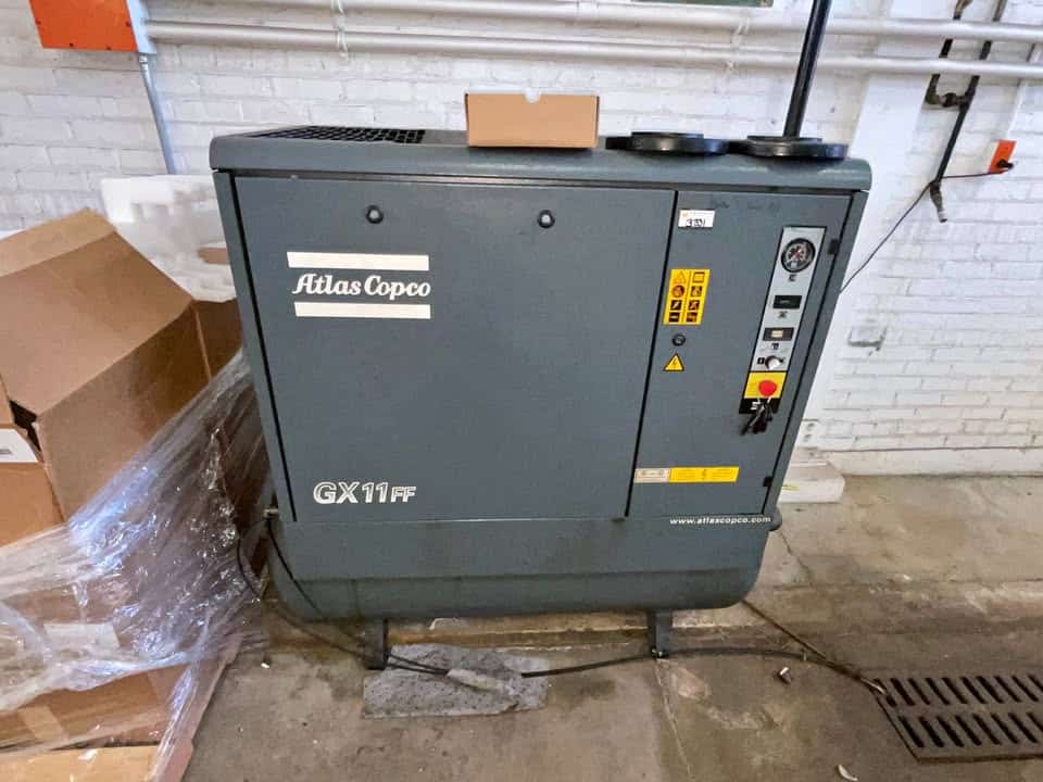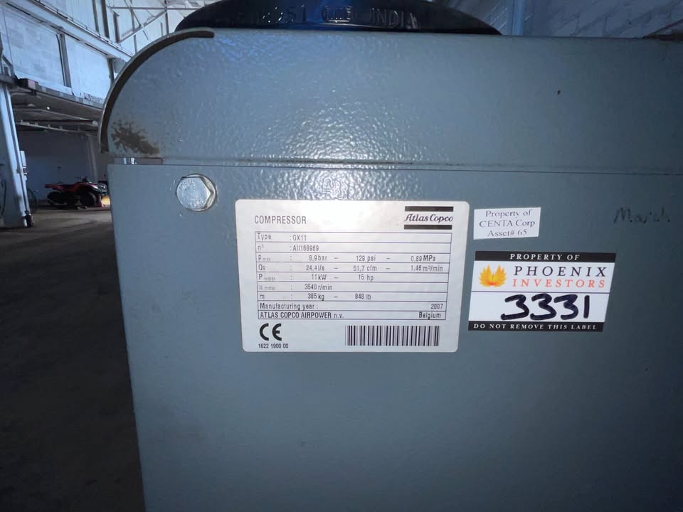 Atlas Copco Type: GX11 Motor: 11kw/15hp Weight: 848 lbs PSI: 129 CFM: 50+